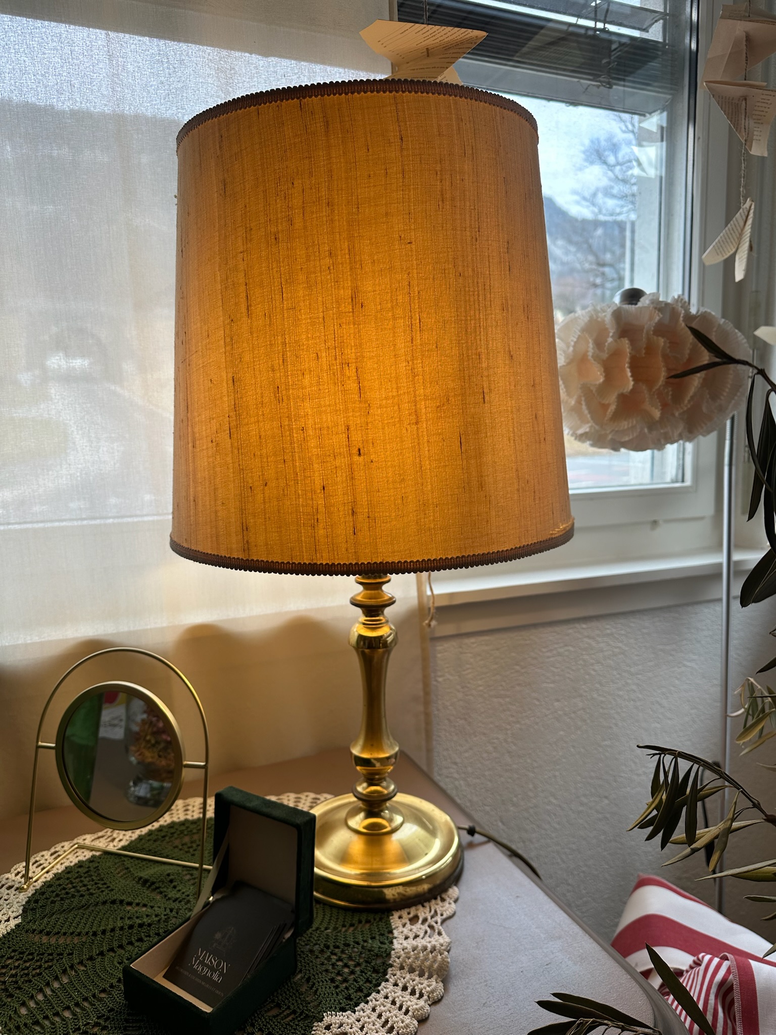 Lampe de table en tissu beige et pied doré, idéale pour créer une lumière chaleureuse et enveloppante lors de votre événement.